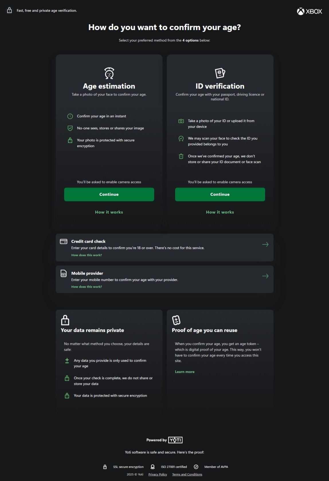 For example, here were the four options that Microsoft offered for their Xbox gaming service. As you can see, it's "powered by Yoti":